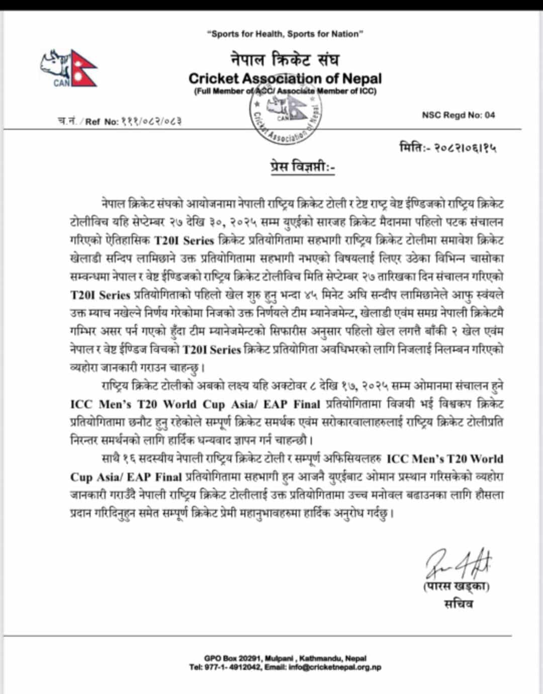 काठमाडौं, असोज १५ – वेस्ट इन्डिजविरुद्धको श्रृंखलामा नेपाली लेग स्पिनर सन्दीप लामिछाने अन्तिम दुई खेलमा नखेल्ने भएका छन्। नेपाल क्रिकेट सङ्घ (क्यान) का सचिव पारख खड्काले जारी गरेको विज्ञप्तिमा सन्दीप निलम्बनमा परेका कारण मैदानमा नउत्रिएको प्रष्टाइएको छ।