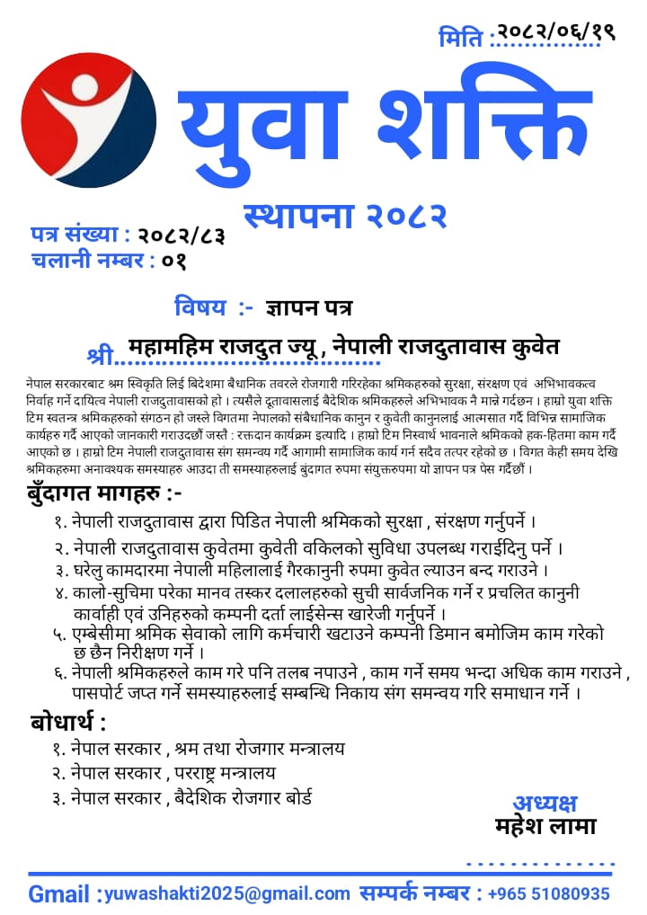 कुवेत – नेपाली श्रमिकहरूको हक हित,सुरक्षा र समस्याहरूको समाधानको माग गर्दै कुवेतस्थित युवा शक्ति टीम कुवेतले नेपाली दूतावासमा ज्ञापनपत्र बुझाएको छ।