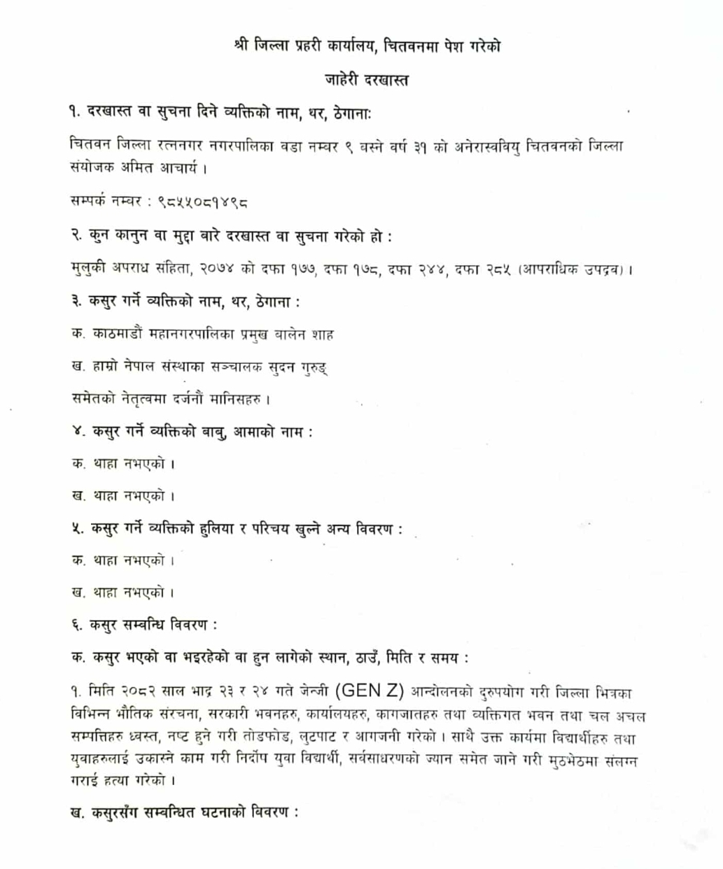 • चितवनमा अनेरास्ववियुद्वारा बालेन र सुधनविरुद्ध जाहेरी दर्ता प्रयास, प्रहरीले दर्ता नगरी ज्ञापनपत्र लिने तयारी
