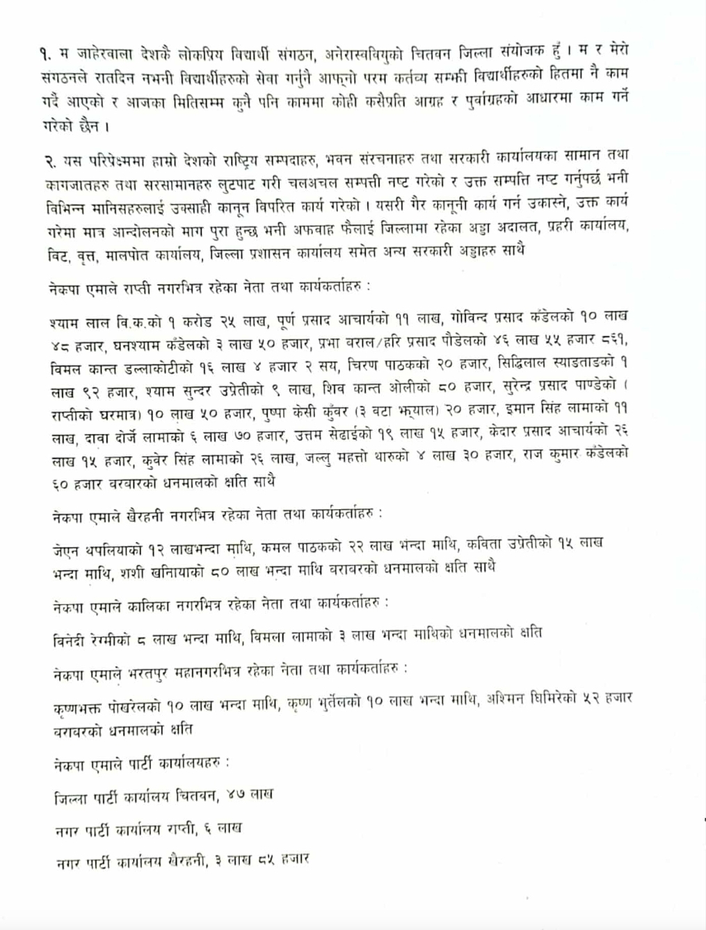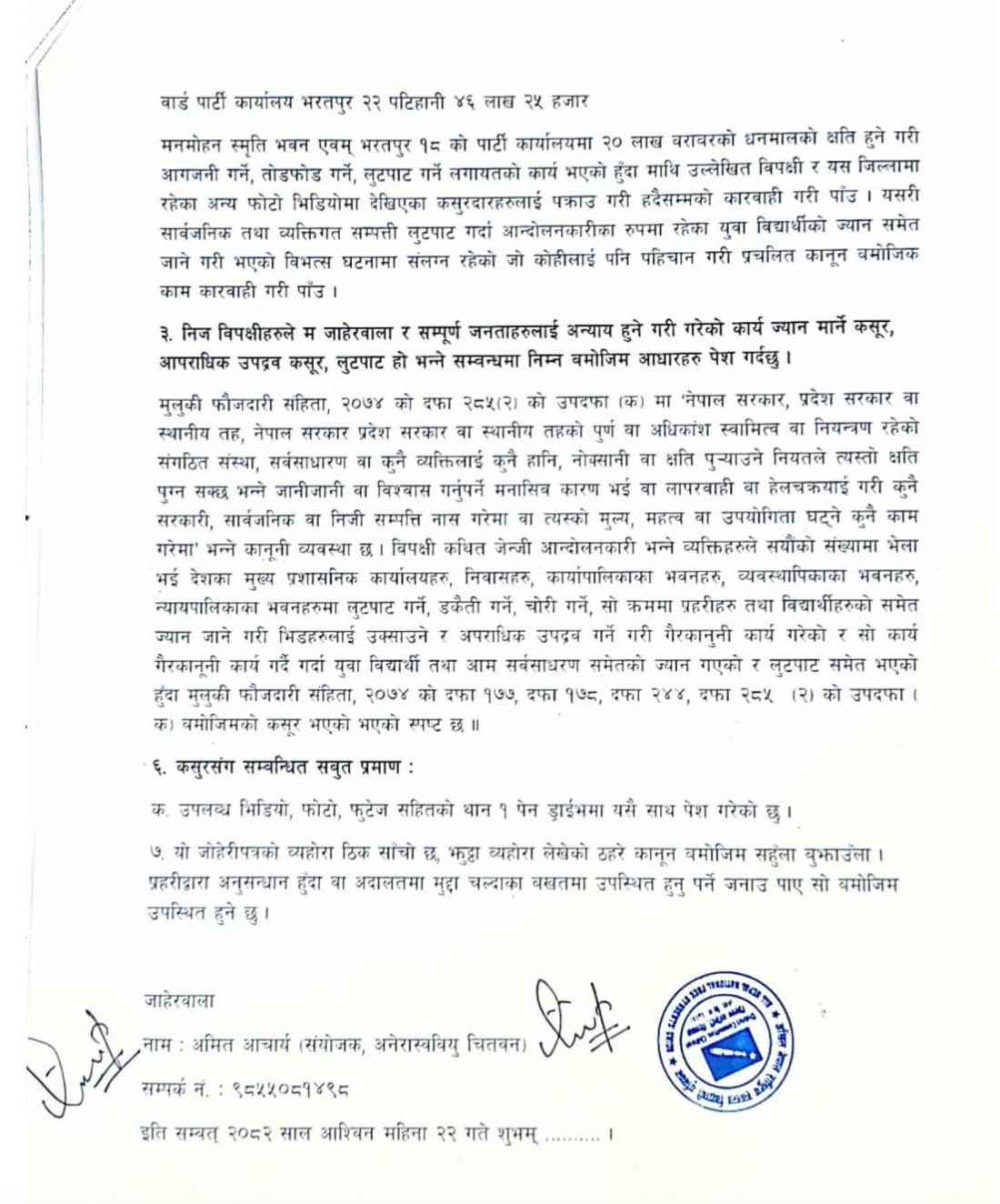 जाहेरीमा उल्लेख छ कि बालेन र सुधनको उक्साहटमा जिल्लाभरका करिब ५ करोड ४६ लाख बराबरको पार्टी र व्यक्तिगत सम्पत्ति क्षति भएको थियो। राप्ती नगरपालिकामा ३ करोड २५ लाख, खैरहनीमा ५० लाख, कालिका नगरपालिकामा ११ लाख र भरतपुर महानगरमा २० लाख ५२ हजार बराबरको क्षति भएको अनेरास्ववियु चितवनका संयोजक अमित आचार्यले जानकारी दिए।