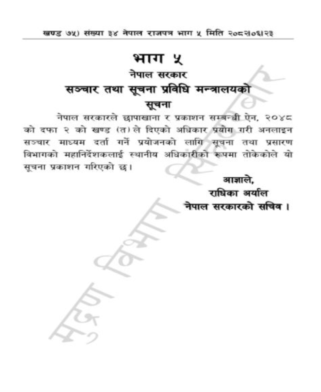 सञ्चार तथा सूचना प्रविधि मन्त्रालयकी सचिव राधिका अर्यालले छापाखाना र प्रकाशन सम्बन्धी ऐन, २०४८ को दफा २(त) मा दिइएको अधिकार प्रयोग गर्दै सूचना तथा प्रसारण विभागका महानिर्देशकलाई स्थानीय अधिकारीको रूपमा तोकिएको जानकारी दिइन्।