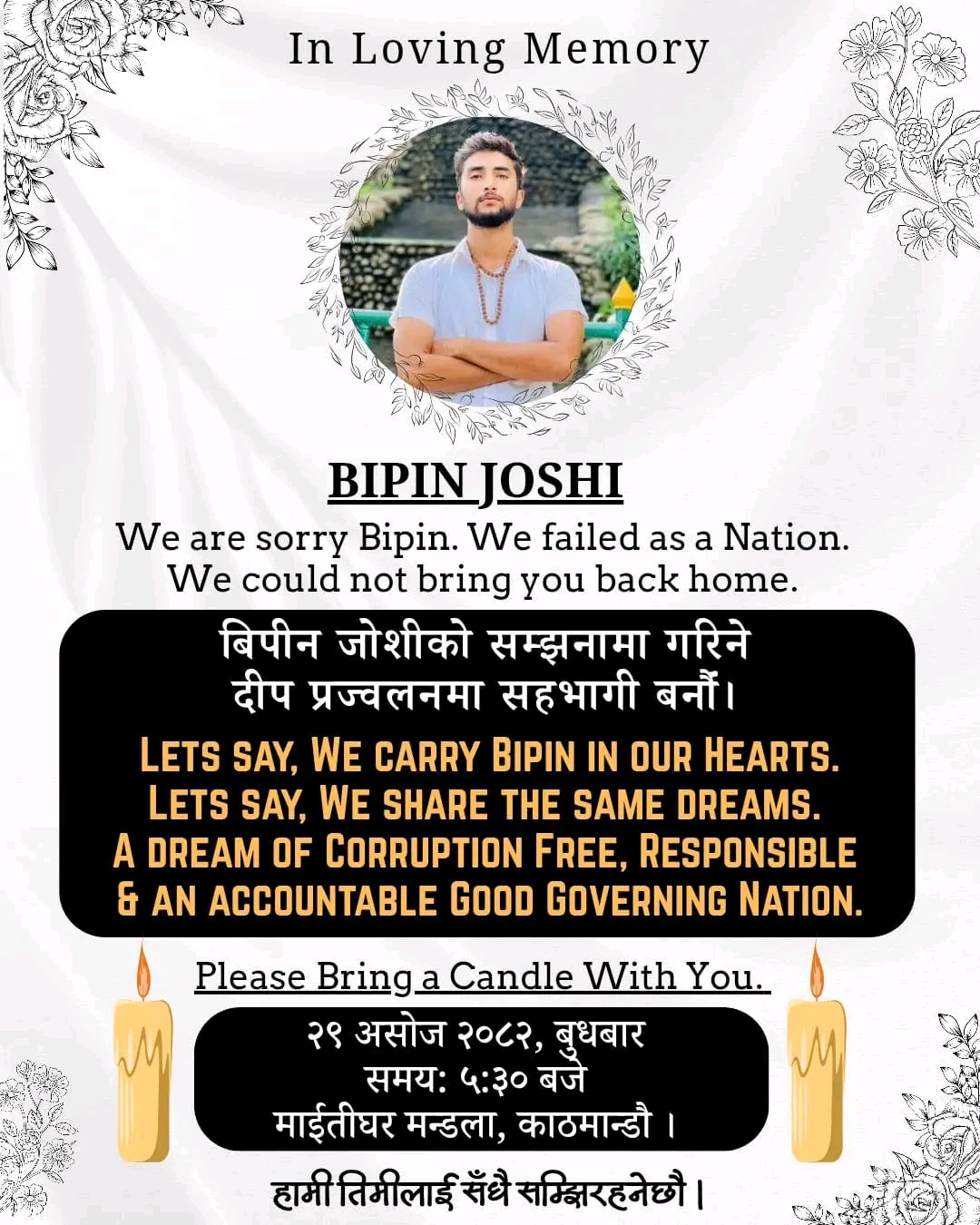 काठमाडौं, असोज २९ – इजरायलमा अपहरणमा परेर ज्यान गुमाएका विपिन जोशीको सम्झनामा जेनजीका युवाहरू बुधबार माइतीघर मण्डलामा दीप प्रज्वलन गर्ने भएका छन्।
