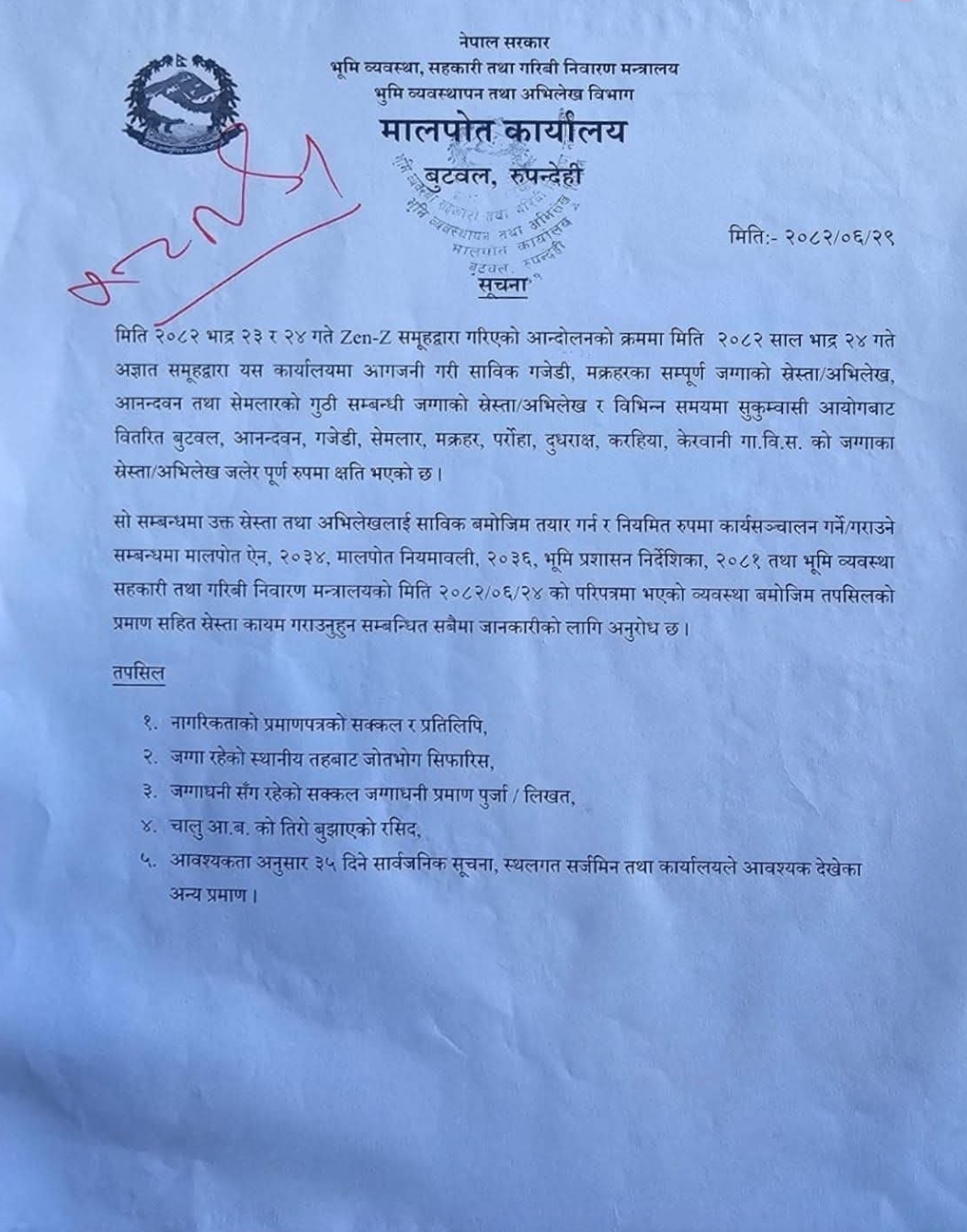 रुपन्देही, असोज ३१ — जेनजी आन्दोलनका क्रममा जलेका जग्गाधनीका कागजपत्र पुनः व्यवस्थित गर्न मालपोत कार्यालय बुटवलले जग्गाधनीहरूलाई स्रेस्ता कायम गराउन कार्यालयमा उपस्थित हुन अनुरोध गरेको छ।