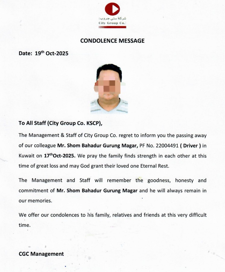 कुवेत सिटी, कुवेत। कुवेतको सिटी ग्रुप कम्पनीमा ड्राइभरका रूपमा कार्यरत होम बहादुर मगरको १७ अक्टोबर २०२५ को दिन कार्यस्थलमै हृदयघातका कारण मृत्यु भएको छ।
