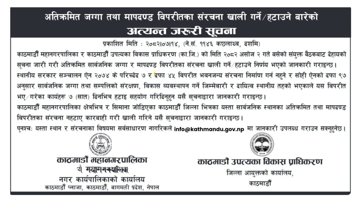 महानगरले बिहीबार सार्वजनिक सूचना जारी गर्दै मापदण्ड विपरीत बनेका तथा सार्वजनिक जग्गा मिचेका संरचना सात दिनभित्र आफैं हटाउन निर्देशन दिएको थियो। स्थानीय सरकार सञ्चालन ऐन, २०७४ अनुसार सार्वजनिक सम्पत्ति र जग्गाको संरक्षण स्थानीय तहको जिम्मेवारी हुने उल्लेख महानगरले गरेको छ।
