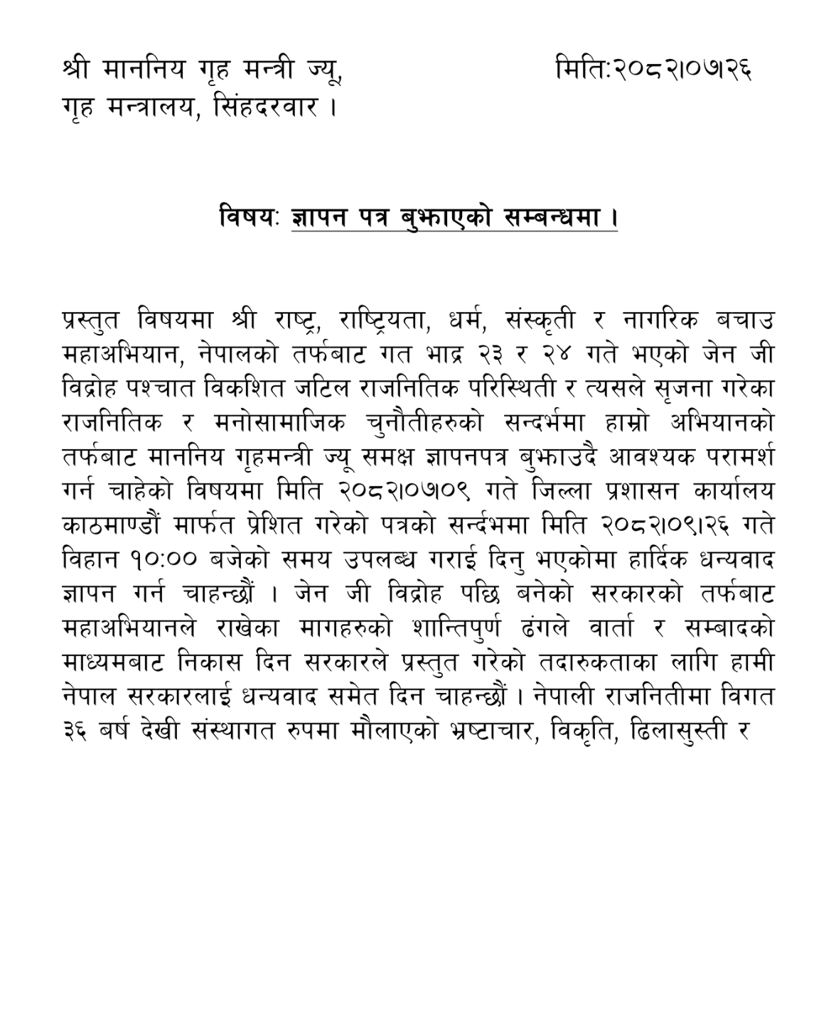 काठमाडौं, कार्तिक २६ – विवादास्पद व्यवसायी दुर्गा प्रसाईं नेतृत्वको ‘राष्ट्र, राष्ट्रियता, धर्म, संस्कृति र नागरिक बचाऔं महाअभियान’ले बुधबार गृह मन्त्रालयमा २७ बुँदे मागपत्र बुझाएको छ।