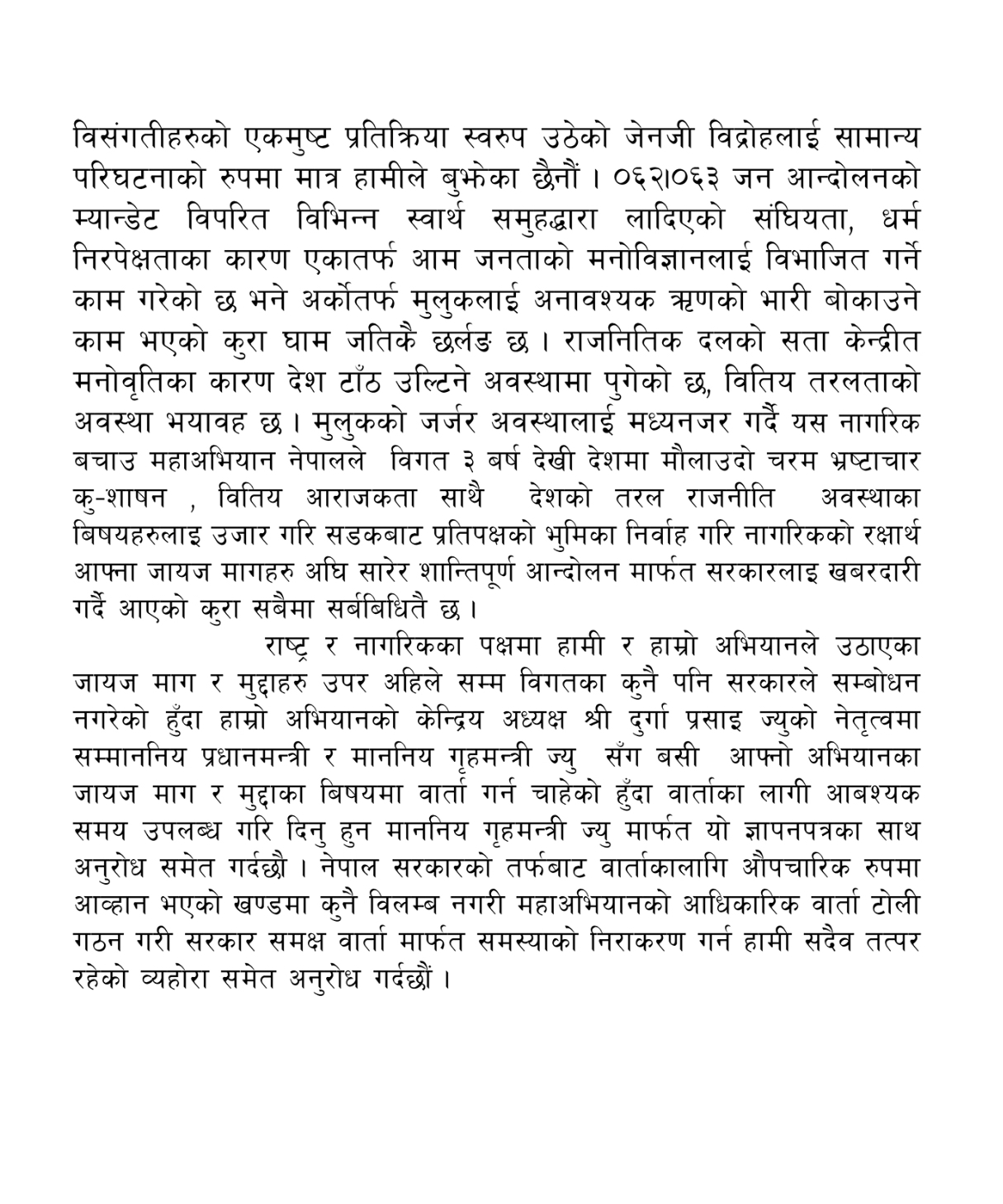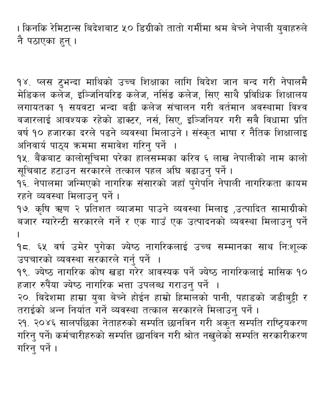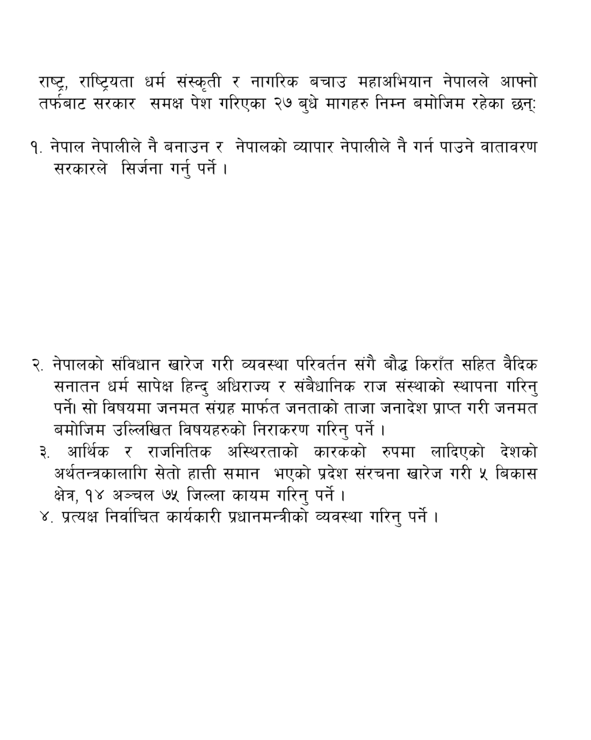 मागपत्रमा संविधान खारेज गरी राजसंस्था पुनर्स्थापना गर्नुपर्ने, प्रत्यक्ष निर्वाचित कार्यकारी प्रधानमन्त्रीको व्यवस्था ल्याउनुपर्ने, र नेपालमा नेपालीकै आर्थिक अधिकार सुनिश्चित गर्नुपर्ने जस्ता विषय समावेश छन्।