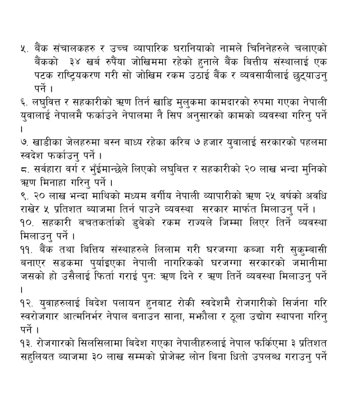 समूहले प्रदेश प्रणाली खारेज गरी पुराना पाँच विकास क्षेत्र, १४ अञ्चल र ७५ जिल्ला कायम गर्नुपर्ने माग गरेको छ। साथै, बैंक तथा वित्तीय संस्थालाई राष्ट्रियकरण गरी जोखिम रकमको व्यवस्थापन गर्नुपर्ने, सहकारी र लघुवित्तबाट लिएका साना ऋण मिनाहा गर्नुपर्ने, र ठूला ऋणलाई कम ब्याजदरमा किस्ताबन्दीमा तिर्न पाउने सुविधा दिनुपर्ने उल्लेख छ।