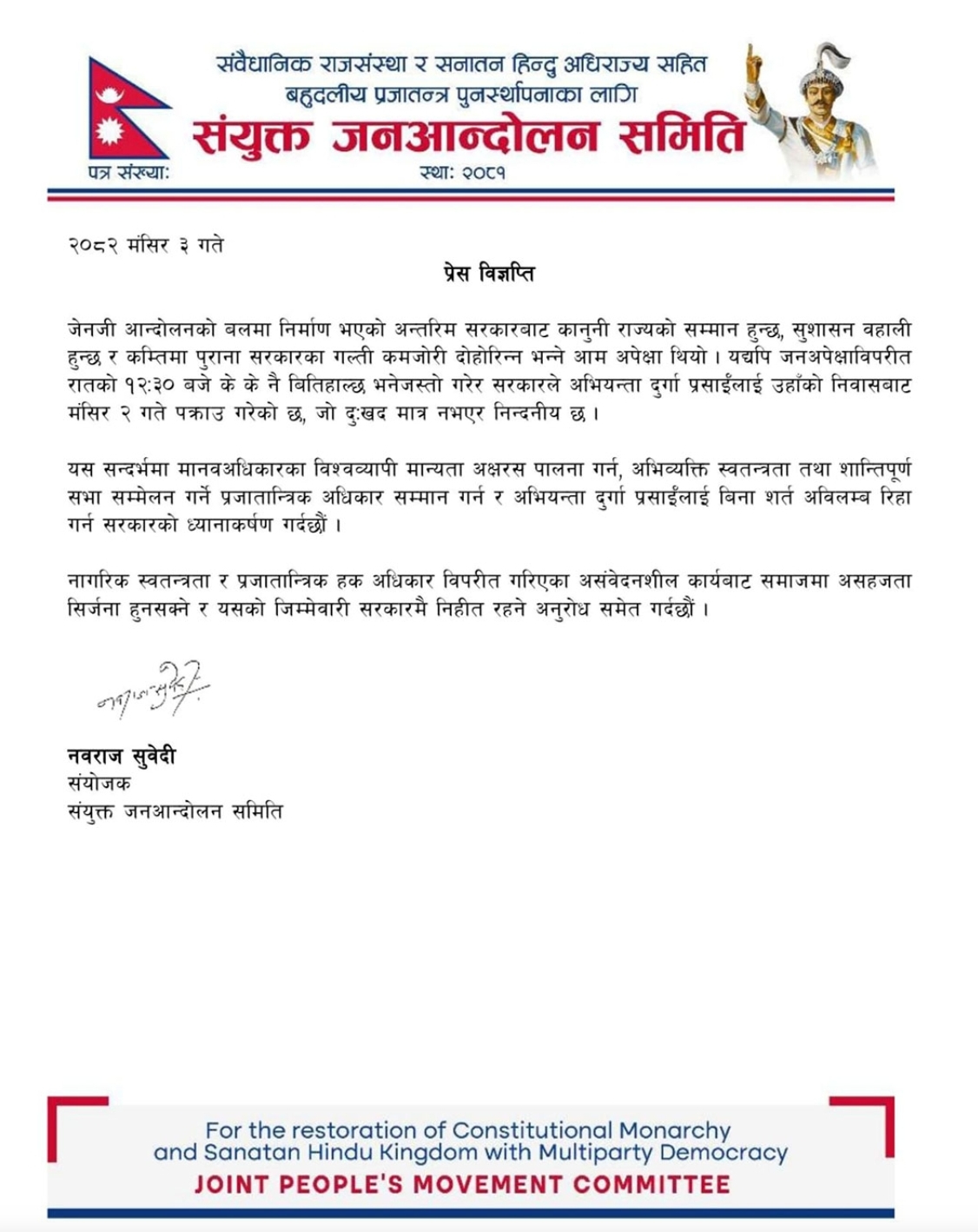 काठमाडौँ, मंसिर ३ – दुर्गा प्रसाईंलाई मध्यराति घरबाटै पक्राउ गरिएको घटनाप्रति संयुक्त जनआन्दोलन समितिले कडा आपत्ति जनाएको छ। समितिका अनुसार मंसिर २ गते राति करीब १२:३० बजे गरिएको प्रहरी कारबाही जनअपेक्षासँग मेल नखाने र लोकतान्त्रिक अभ्यासविपरीत देखिन्छ।