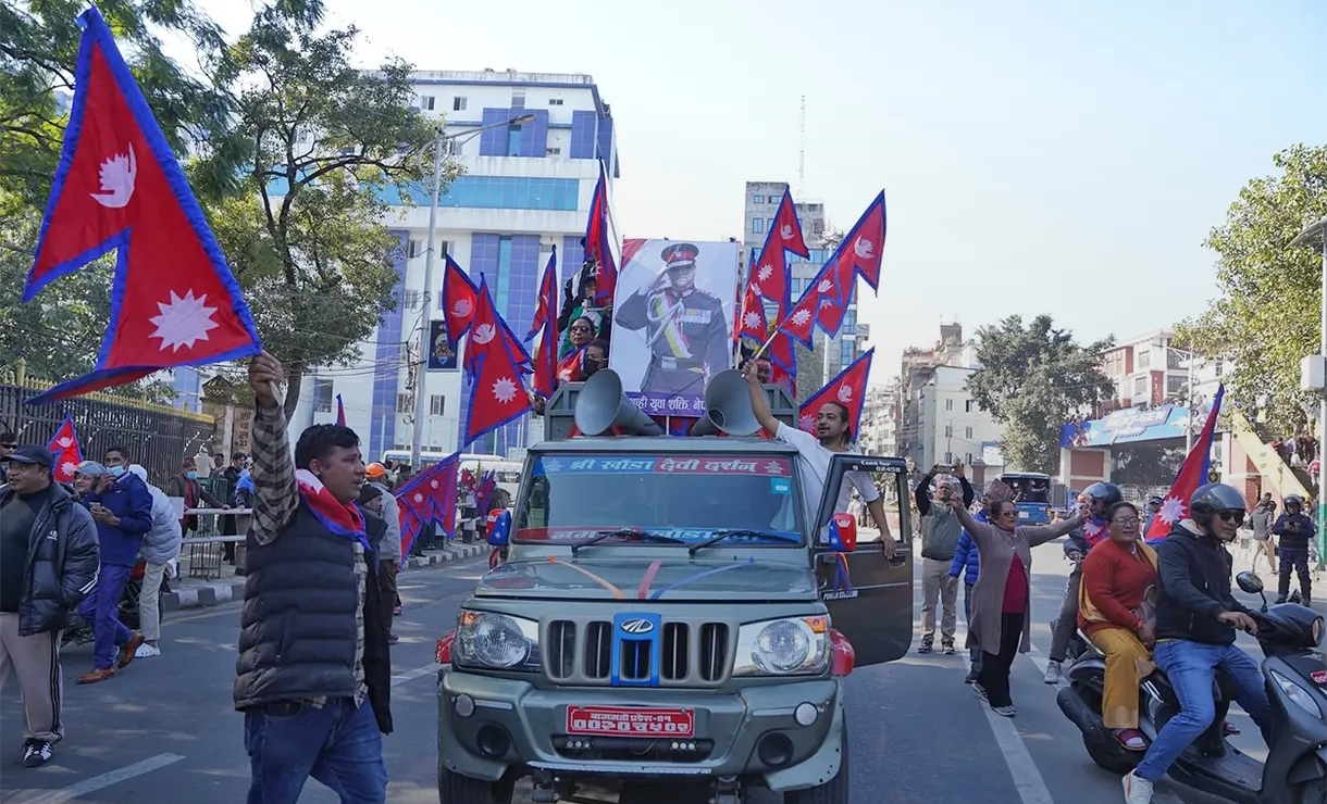 राप्रपाका नेता तथा कार्यकर्ताहरू रत्नपार्क क्षेत्रमा जुलुससहित भेला भएका थिए। प्रदर्शनमा सहभागीहरूले राष्ट्रिय झण्डासँगै पूर्वराजा ज्ञानेन्द्र शाह र रानी कोमलको फोटो अंकित प्लेकार्ड बोकेका थिए।