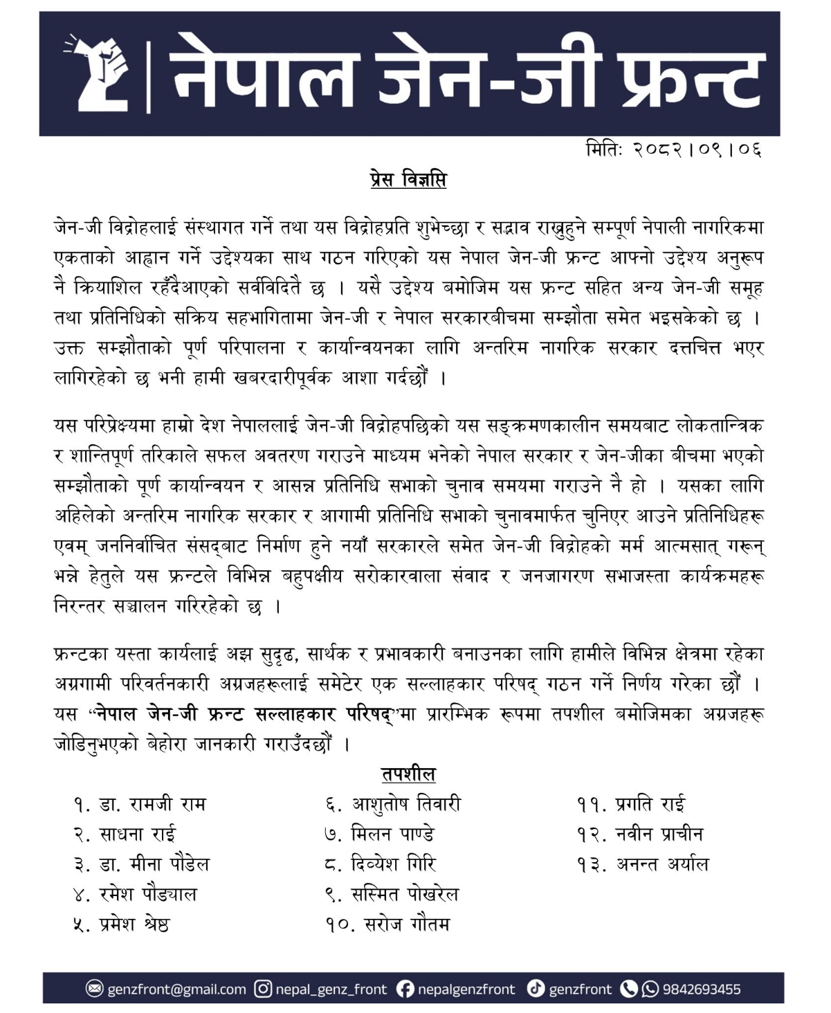 काठमाडौं, पुस ६ – नेपाल जेनजी फ्रन्टले आफ्नो कार्यकुशलता बढाउन नयाँ सल्लाहकार परिषद गठन गरेको छ। १३ सदस्यीय यस परिषदमा राष्ट्रिय स्वतन्त्र पार्टी (रास्वपा)मा नजोडिएका विवेकशील साझाका नेताहरू पनि समावेश छन्।