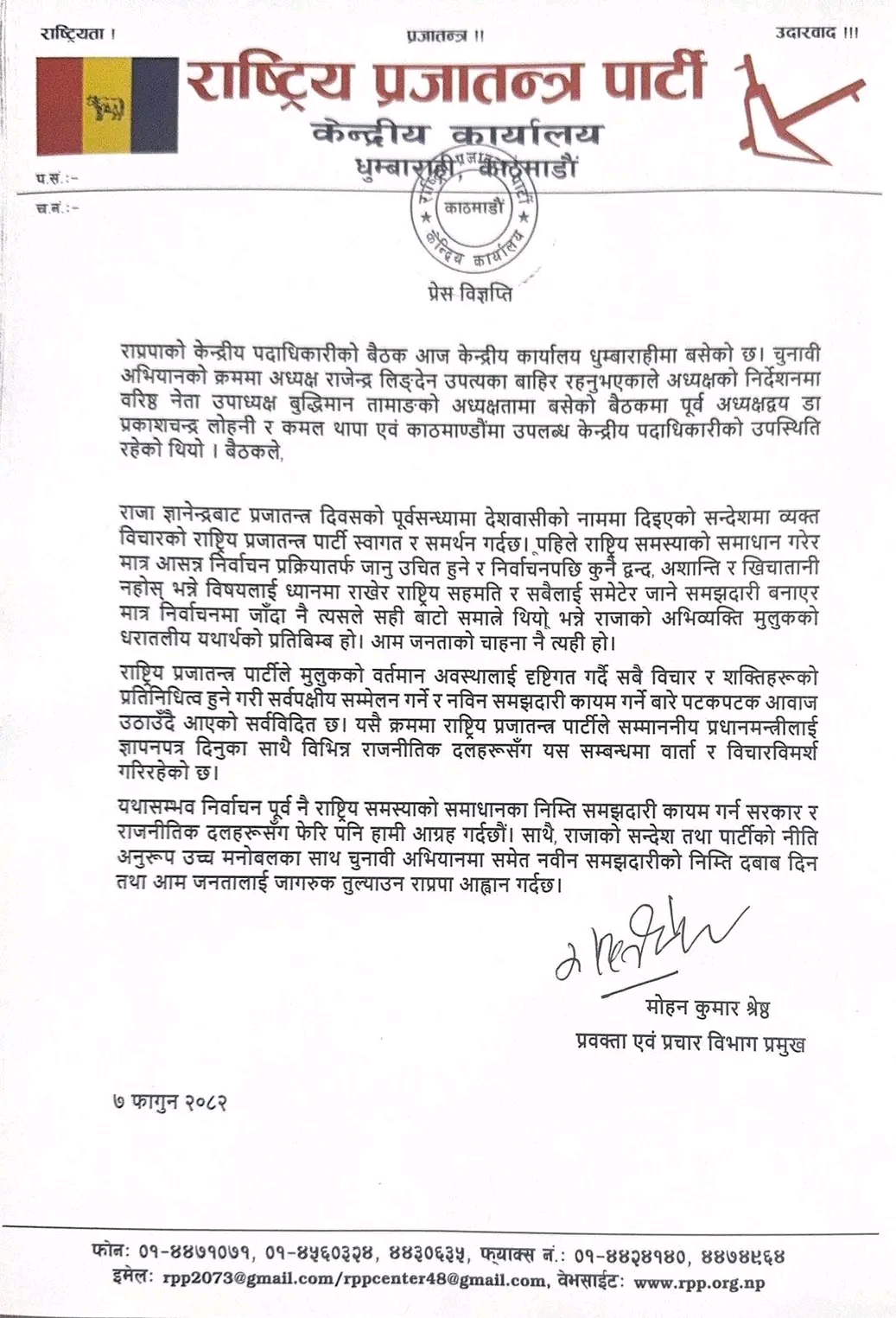 राप्रपाले सबै राजनीतिक शक्ति र सरोकारवालालाई समेटेर साझा समझदारीको वातावरण तयार पार्नुपर्नेमा जोड दिएको छ। पार्टीको भनाइमा राष्ट्रिय सहमतिको आधारमा अघि बढ्दा मात्र निर्वाचनले दीर्घकालीन स्थिरता दिन सक्छ।