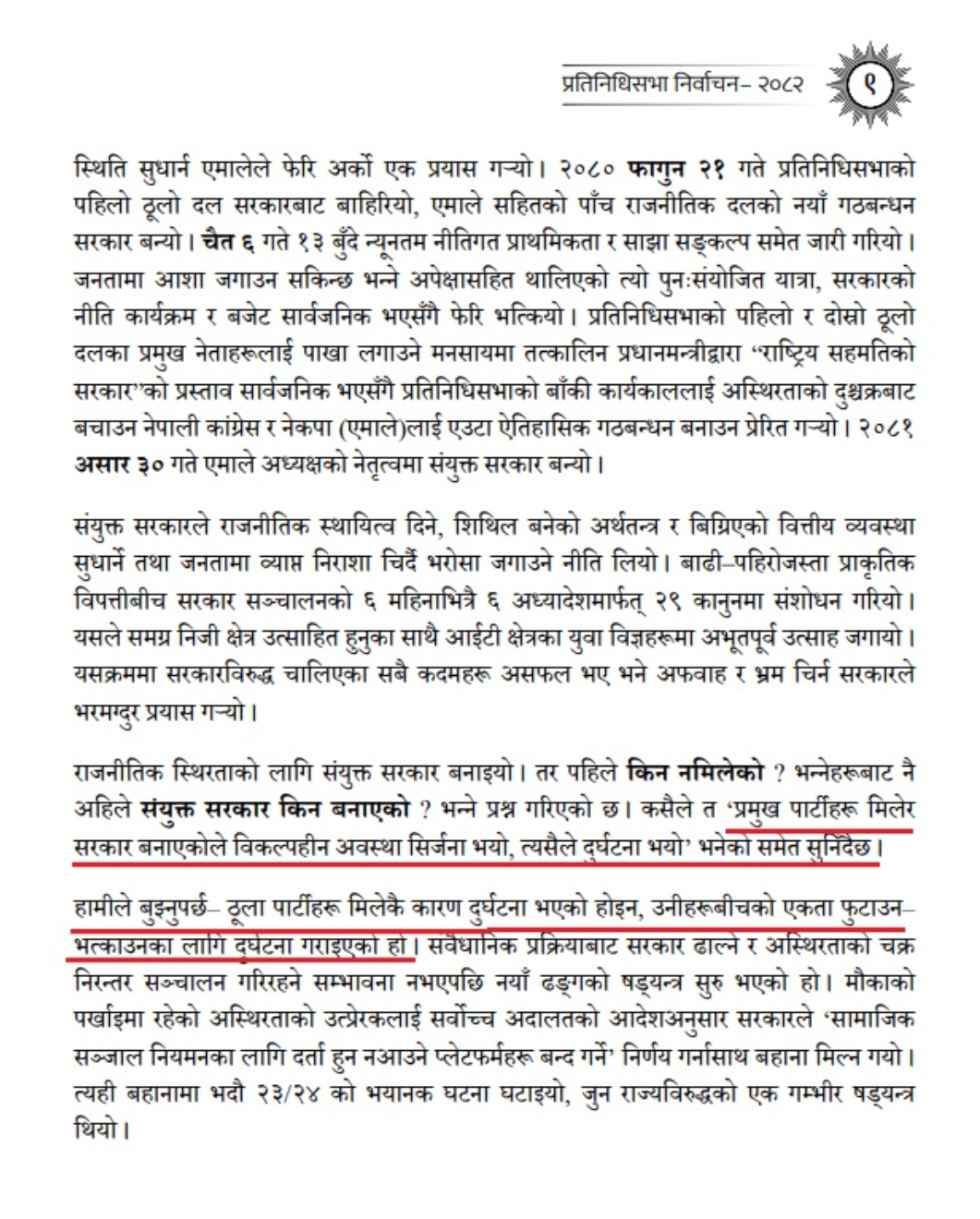 घोषणापत्रको सुरुवातमै अध्यक्ष केपी शर्मा ओली ले राजनीतिक स्थायित्वका लागि संयुक्त सरकार गठन गरिएको उल्लेख गरेका छन्। उनले ठूला दलहरू मिलेकै कारण दुर्घटना भएको भन्ने तर्क अस्वीकार गर्दै, संवैधानिक प्रक्रियाबाट सरकार हटाउन नसकेपछि एकता तोड्ने उद्देश्यले नयाँ ढंगको खेल सुरु गरिएको बताएका छन्।