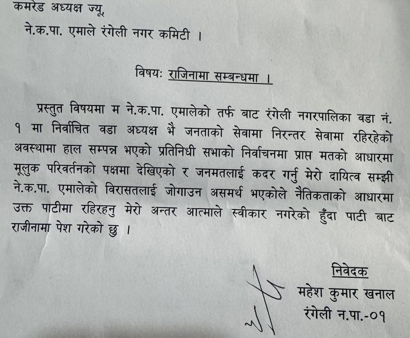 रबिन्द्र बराल/ मोरङ, रङ्गेली – नेपाल कम्युनिष्ट पार्टी (एमाले)बाट दुई पटक निर्वाचित रङ्गेली नगरपालिका वडा नं. १ का वडा अध्यक्ष कृष्ण खनालले आज आफ्नो फेसबुकमार्फत औपचारिक रूपमा पार्टी परित्याग गरेको घोषणा गरेका छन्। उनी विगत दुई कार्यकालदेखि वडा अध्यक्षका रूपमा जनताको सेवा गर्दै आइरहेका छन्।