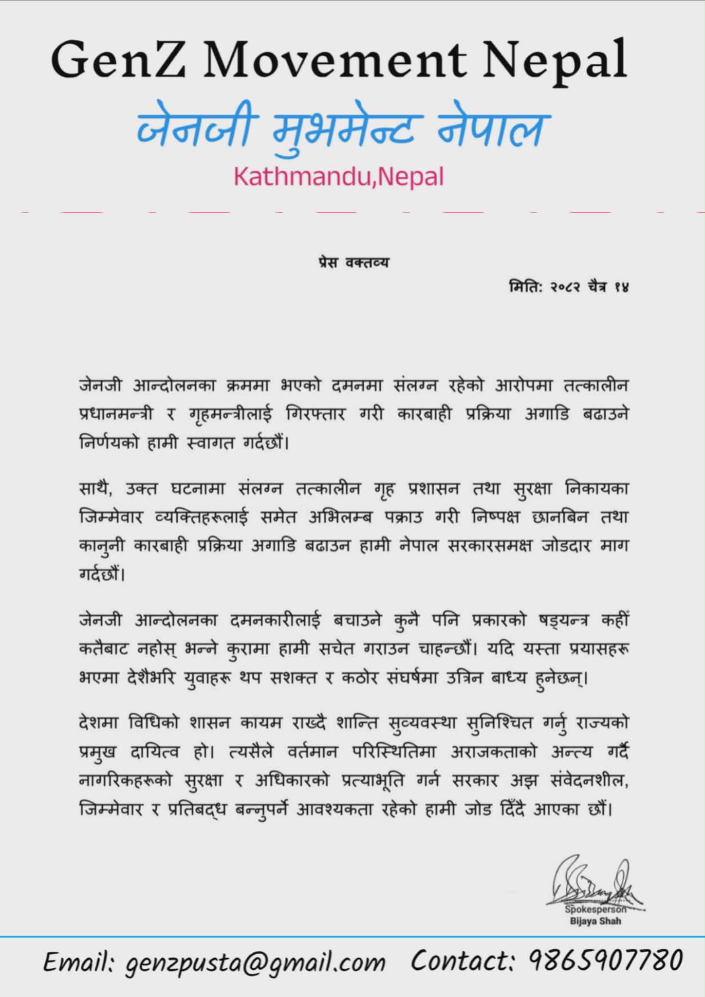 काठमाडौं — जेन्जी आन्दोलनका क्रममा भएको दमनप्रति लक्षित गर्दै जेनजी मुभमेन्ट नेपालले तत्कालीन प्रधानमन्त्री र गृहमन्त्री मात्र नभई संलग्न सुरक्षा निकायका जिम्मेवार व्यक्तिहरूलाई समेत पक्राउ गरी कारबाही प्रक्रिया अगाडि बढाउन सरकारसँग माग गरेको छ।