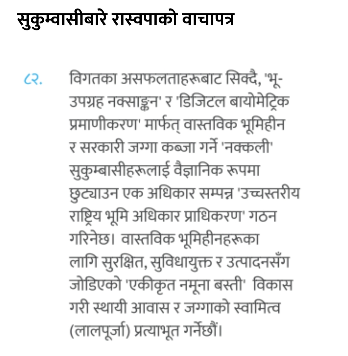 यसैबीच, रास्वपाले चुनावी वाचापत्रमा सुकुम्वासी समस्या समाधानका लागि ‘उच्चस्तरीय राष्ट्रिय भूमि अधिकार प्राधिकरण’ गठन गर्ने उल्लेख गरेको थियो। सो प्राधिकरणमार्फत वास्तविक र नक्कली सुकुम्वासी छुट्याउन आधुनिक प्रविधिको प्रयोग गरिने र वास्तविक भूमिहीनलाई स्थायी आवास तथा लालपूर्जा उपलब्ध गराउने लक्ष्य राखिएको छ।